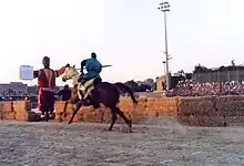 Historical competitions are widespread throughout the Italian national territory, such as the Palio, the name given in the country to an annual athletic contest, very often of a historical character, pitting the neighbourhoods of a town or the hamlets of a comune against each other. Typically, they are fought in costume and commemorate some event or tradition of the Middle Ages and thus often involve horse racing, archery, jousting, crossbow shooting, and similar medieval sports.[36] The Palio di Siena is the only one that has been run without interruption since it started in the 1630s and is definitely the most famous all over the world.[37]