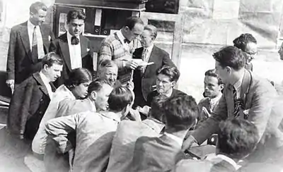 In 1933, shortly after the Nazi seizure of power, Herseni visited Berlin, befriending there the anti-Nazi Romanian Petre Pandrea.[26] He took his Ph.D. in 1934, with the dissertation paper Realitatea socială ("Social Reality"), an "essay in regional onthology". It earned praise from Gusti, who called Herseni "one of the most gifted and educated [youths] of today's generation", one promising to "enrich Romanian sociology and philosophy with very valuable works."[4] Stahl recalls that only Herseni could match his teacher's "surprisingly vast erudition" and "systematization" of received knowledge; he was also among the more loyal of Gusti's gifted disciples, effectively replacing Petre Andrei, who had spoken out against the ISR.[27] Herseni was an enthusiastic promoter of sociological campaigns, famous as the ISR's "polygraph" and as Gusti's most orthodox interpreter.[28]
