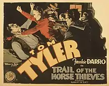 Trail of the Horse Thieves is a 1929 American silent Western film directed by Robert De Lacey and written by Frank Howard Clark and Helen Gregg. The film stars Tom Tyler, Betty Amann, Harry O'Connor, Frankie Darro, Barney Furey and Bill Nestell. The film was released on January 13, 1929, by Film Booking Offices of America.[1][2][3]