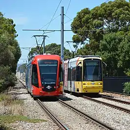 The two models of tram introduced for Adelaide's tramways revival: 200 Series, Alstom Citadis (left) and 100 Series, Bombardier Flexity Classic, on the 9.25 kilometres (5.75 miles) reserved line between Adelaide and Glenelg