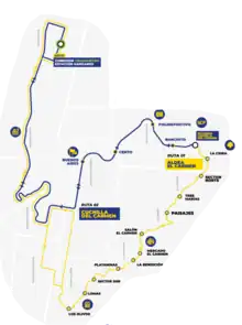"Route 2" or "Cuchilla Del Carmen" was the second route to begin operations with the TransPinula system. The route runs from the loop at Cuchilla Del Carmen in Santa Catarina Punila, then travels through the north side of the city until it reaches Hincapie Avenue. It then travels north to reach Hangares station and connect to Transmetro's line 13. The same alignment is followed on its return.