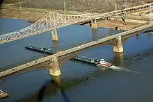 Barges pass beneath the Eads and Martin Luther King bridges at St. Louis