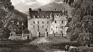 The Bear Gates at the main entrance to the grounds were installed by the fifth Earl, Charles Stuart, in 1738. When they were closed, after Charles Edward Stuart (Bonnie Prince Charlie) passed through in 1745, the Earl vowed they would never be opened again until a Stuart king returned.[3][4]