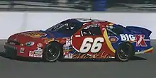 Travis Carter Enterprises returned in 1994 as the No. 23 Camel Cigarettes-sponsored Ford Thunderbird driven by Hut Stricklin. After posting one top ten finish that year, Stricklin was removed as Spencer returned to the team again. Spencer ran in the car for several years, the big change coming when Winston became the sponsor in 1998.[1] That year, Spencer looked poised for a top-ten finish in points, but injuries kept him from doing that as he was replaced by Ted Musgrave and Frank Kimmel while he nursed his wounds. At the end of the year, Carter announced he would expand his team to a multi-car operation, with three-time champion Darrell Waltrip driving the No. 66 Kmart Ford and Haas coming on board as a partner.[2] The new team had previously been the No. 27 owned by David Blair Motorsports. Waltrip amassed the largest number of DNQ's he had ever had during his career. In 2000, he retired from the Winston Cup, his lone highlight being an outside-pole qualifying effort at the Brickyard 400. Kmart also sponsored Spencer's car beginning in 2000, after the team's previous sponsorship agreement with R.J. Reynolds expired, with the team switching to No. 26 after acquiring the number from Roush Racing. Waltrip's replacement was Todd Bodine (who drove a third car in Waltrip’s final race, the No. 46) who won three pole positions and finished 29th in points. After 2001, Spencer departed, and Joe Nemechek signed on to replace him. Unfortunately, during the offseason, Kmart went into bankruptcy, and the team's status was in danger. Nemechek ran a mere handful races that year before his team was folded,[3] and after subbing in several races afterward he signed with Hendrick Motorsports to drive the No. 25 car. Bodine attempted the first few races in the No. 66 and qualified on the pole for the Las Vegas race, but he eventually was parked for several weeks while the team looked for a sponsorship.[3] Frank Kimmel returned for six races in the No. 26 with his National Pork Board sponsorship from the ARCA series. Bodine eventually returned to race the No. 26 after Haas-Carter found full-time sponsorship from Discover Card and split time in the ride with his older brother Geoffrey. The 66 car returned part-time later in the year, with Japanese racer Hideo Fukuyama running a handful of races.