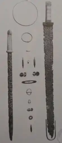 The grave was accidentally uncovered in 1842 by a labourer at Pouan-les-Vallées (Aube), a French village in the canton of Arcis-sur-Aube on the south bank of the Aube. It consisted of a skeleton buried with a number of gold and garnet cloisonné jewels and ornaments, including a gold ring inscribed HEVA,[1] and accompanied by two swords with hilts encased in gold.