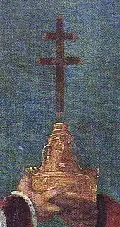 On the left is Mary with her face expressing sorrow, while on the right is St. John with the book of the Gospels clutched to his chest, both richly attired. Both the cross and the two lateral figures are placed atop pyramidal mounds, and the central one, from which the crucifix rises, has at its base the face of a man with closed eyes with three pieces of wood embedded in his head. This man can be identified with Adam, a symbol of the multitude of the righteous resurrected at the time of Jesus' death.[15] At the top of the cross hangs the titulus crucis with the inscription "IC XC," meaning Iésus Christós, completing the iconography of the double transverse cross. Above the horizontal arm of the cross, on either side of the titulus, are depicted two half-length angels with wings and tunic and a veil in their hands, in an attitude of sorrowful veneration. Above, in remembrance of the solar eclipse that occurred at the death of Jesus,[15] are the Sun on the left, depicted as a radiating disk, and a crescent moon and right, a symbol of the Moon. Finally, attached to the top of the cross is the ring that allows the casket to be opened. The staurotheke can be opened by sliding downward the lid, which slides along two rail guides.