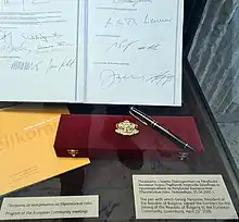 The treaty was signed on 25 April 2005, in Neumünster Abbey, Luxembourg.[7] In addition to the Treaty of Accession a Final Act was signed. The Final Act registers the results of the accession negotiations,[8] including any declarations made by the parties.[9] It also laid down arrangements for the period between signing and entry into force of the treaty.[10] Ratification of the Treaty of Accession is summarized in the table below. The process was completed on 20 December 2006.