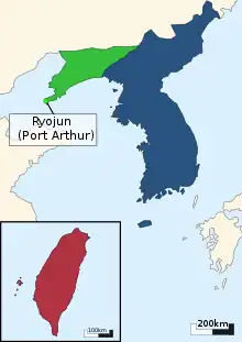 ![]() Japanese sphere of influence Annexed by Japan Annexed by Japan, but temporarily lost due to the Triple Intervention; Kwantung Leased Territory (Ryojun) was later re-annexed after the Russo-Japanese War | |||||||||||