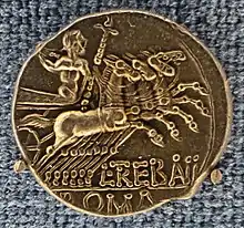 Denarius of Lucius Trebanius. This side is the reverse, depicting Jupiter driving a quadriga, with the inscriptions "L. Treban." and "Roma". The obverse features a head of Pallas, or perhaps Roma.