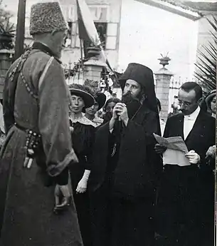 Trabzon Mayor Ioannis Triftanidis & Greek Orthodox metropolitan Chrysanthos welcoming Grand Duke Nikolai Nikolayevich Yudenich who entered the city with the Russian Caucasus Army (April 1916).