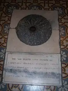 According to a local legend dating back at least to the 15th century,[3] the Tredesin commemorates the announcement of Christianity to the people of Milan by Barnabas, supposedly on March 13, 51 a.C., when Barnabas drove a cross on a round stone decorated with a central hole and 13 radiuses. Where Barnaba walked, snow would melt and flowers would appear. A stone preserved in the church of Santa Maria al Paradiso, in the surroundings of Porta Vigentina, is associated to the legend.