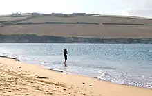 Tregirls beach (which takes its name from the settlement) is 500 metres north at grid reference SW 911 769. The north-facing beach is in the River Camel estuary and is backed by dunes with a small stream trickling across the sand at low tide from the corner of the beach tucked hard behind Stepper Point known as Harbour Cove.[3][4] Beyond Harbour Cove towards Stepper Point is Hawkers Cove, previously the location of the RNLI Padstow lifeboat,[5] now too shallow even at high tide and dry sand at low tide, the result of the sands shifting over the years. The South West Coast Path runs behind the beach[6] before climbing above the rocky side of the river at Hawkers Cove on its way to the Daymark on Stepper Point.