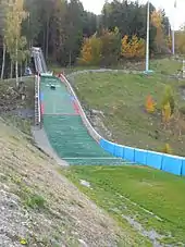 In 2004, the venue was upgraded for €1 million by installing a K60 inrun between the normal and large hill. This allowed the medium inrun to use the same outrun as the normal hill. In 2008, a small K25 hill, named Ninoufbakken, was installed slightly away from the main hills.[1] The venue's certificate was due to expire in 2011, after which the venue would have to meet the International Ski Federation's (FIS) latest regulations. A €1.5 million upgrade program was initiated, which saw the inruns renovated, including installation of the Ski-Line track system and new Porsgrund ceramic tracks. The outruns saw new plastic mats and a new sprinkler system. The Nordic House, a sports centre, was also built. Construction started on the normal hill in May 2011 and on the large hill in August 2011, with completion scheduled for early 2012.[6]