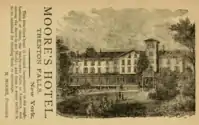 "Once a vacation spot for the country's elite, the falls were all but closed to the public for 100 years by the various power companies that used the waterway to generate electricity."[2] Utica Electric Light & Power Company received Moore's Hotel and surrounding land in 1897. Because of the creation of the hydroelectric powerhouse and the dam in 1899, the City of Utica, New York was able to receive electricity from Trenton Falls in 1901.