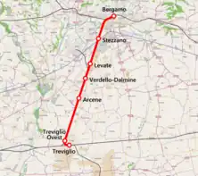 The Treviglio–Bergamo railway is a railway line in Lombardy, Italy. The railway infrastructure is managed by the Rete Ferroviaria Italiana, which classifies it as one of its complementary lines.[2] The passenger service is operated by Trenord as a regional service.