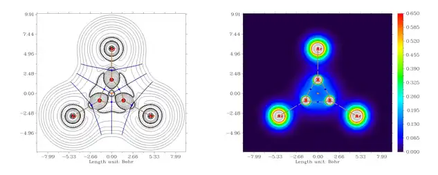 AIM analysis reveals strong polarization of the noble gas Ar in the adduct B3Ar3+.[19] Left: The Laplacian of the electron density distribution. Right: The electron density distribution.[20]