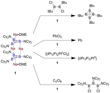 Na4[B3(NCy2)3]2 • 2 DME acts as a strong reductant on a variety of substances.[7]