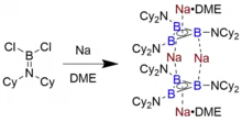 Na4[B3(NCy2)3]2 • 2 DME is synthesized by direct reduction of a boron precursor.[7]