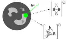 Negatively charged ions containing triboracyclopropenyl have proven amenable to study by photoelectron spectroscopy. By Koopman's theorem, neglecting the effects of strong electron correlation, the kinetic energies of electrons detached by X-rays can be mapped onto binding energies of individual orbitals and reveal the molecular electronic structure.[26][27] Splitting of the resulting spectral peaks from "vibrational progression" (according to the Franck-Condon principle) indicates how ionization at different energies changes specific vibrational frequencies of the molecule, and such effects on bonding are interpreted in terms of changes to the electron configuration. In B3, an unusually high-intensity and high energy band corresponding to a multielectron or "shake-up" transition (coupled electron detachment and electronic excitation) was observed, suggesting the strong electron correlation present in the triboracyclopropenyl fragment.[4] For IrB3, vibrational progression from the stretching and breathing vibrations of IrB3 could be assigned in the overlaid spectra of both isomers present in the cluster beam. By comparison to computations, the minimum energy structure of IrB3 could then be formulated as a tetrahedron with an intact, aromatic B3+ moiety.[8]
