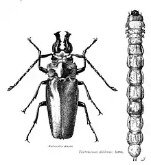 Adult Trictenotomidae can be mistaken for Cerambycidae (Prioninae) or Lucanidae but their 5-5-4 tarsal formula makes them distinctive. They have a long 11-segmented antenna. There are no fossil species known as yet, and nearly all the species are found mainly along the Himalayas extending into China, Korea, the Sunda Islands, and the Philippine Archipelago.[3] Trictenotoma grayi is found in the Western Ghats of peninsular India while T. templetonii is found in Sri Lanka. Adult beetles are attracted to lights and specimens are found widely in collections around the world however very little was known of their life-history until the habits of Trictenotoma formosana were studied in captivity in Taiwan in 2019. Based on that species, these are thought to breed in wood, the eggs being laid under bark. The eggs hatch after about 10 days. The larvae are carnivorous and can be cannibalistic. They build tunnels in soft wood in which they stay. They feed on their exuviae and may undergo 8-9 moults over the course of one and a half years before they pupate. The pupae eclose in 40 to 46 days as adults. Adults feed on tree sap.[4]