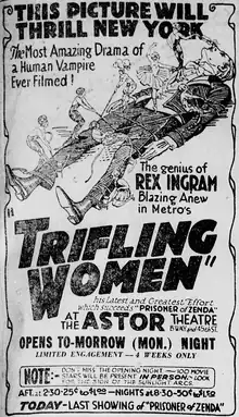 Trifling Women is a 1922 American silent romantic drama film directed by Rex Ingram. It is credited with boosting the careers of its leads, Barbara La Marr and Ramon Novarro. It has been described as Ingram's most personal film.[1]: 41