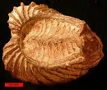 Members of the Trigoniidae are identified by the large and complex dentition that joins the two valves together and allows articulation. The teeth and supporting area can take up almost a third of the volume of the shell. The hinge structure is amongst the most complex of all bivalves, namely that the teeth are numerous and ridge-like with strong transverse striations. It is these striations which distinguishes the Trigoniidae from the more primitive Myophoriidae. The Trigoniidae almost certainly evolved by a monophyletic modification of a Triassic myophoriid, with three genera appearing in the Middle Triassic.[1]