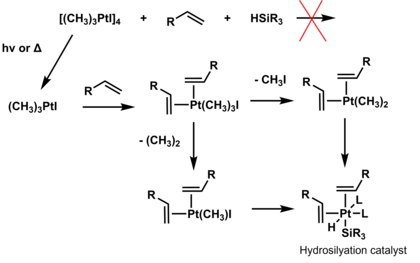 Like other platinum complexes, the trimethylplatinum iodide complex can lead to hydrosilylation of alkenes.[4] While the tetramer itself cannot catalyze hydrosilylation, when it is heated in dodecane in the presence of olefins and hydrosilanes, the subsequent decomposition of the tetramer can generate platinum species that can perform catalytic homogeneous hydrosilyation. The decomposition can be done photolytically in the crosslinking of silicon rubber.[16]