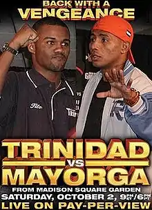 The Trinidad versus Mayorga fight, also known as "Back with a Vengeance", was a boxing event pitting former world champions Felix Tito Trinidad and Ricardo Mayorga. The fight took place on October 2, 2004, under the promotion of Don King, at the Madison Square Garden in New York City, United States.