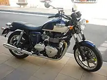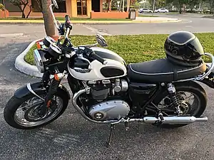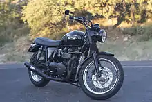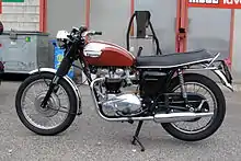 The original Triumph Bonneville was a 650 cc parallel-twin motorcycle manufactured by Triumph Engineering and later by Norton Villiers Triumph between 1959 and 1974. It was based on the company's Triumph Tiger T110 and was fitted with the Tiger's optional twin 1 3/16 in Amal monobloc carburettors as standard, along with that model's high-performance inlet camshaft. Initially it was produced with a pre-unit construction engine which enabled the bike to achieve 115 mph without further modification, but later in 1963 a unit construction model was introduced which was stiffer and more compact, including additional bracing at the steering head and swing arm. The steering angle was altered and improved forks were fitted a couple of years later, which, together with the increased stiffness enabled overall performance to match that of the Bonneville's rivals.[2] Later T120 Bonnevilles used a new frame which contained the engine oil instead of using a separate tank; this became known as the oil in frame version. The T120 engine, both in standard configuration and especially when tuned for increased performance, was popular in café racers such as Tribsas (BSA frame) and particularly Tritons (Norton featherbed frame).