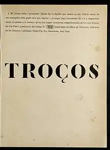 Troços is an avant-garde Catalan magazine published for the first time in 1916. It was directed by Josep Maria Junoy, who was also the owner of the magazine. Only 101 copies were printed of the first edition. This number had 8 pages and the measurements were 223 x 135 mm. Its impression was a high quality one and it was done in the printing house Oliva de Vilanova. Its price was 2.50 pesetas.[1]