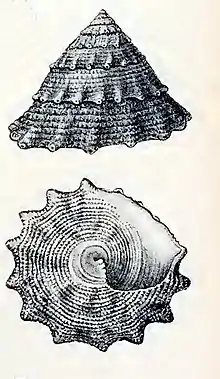 | Drawing showing two views of a shell of Trochus tubiferus | |