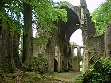 Imposing ruins are all that remain of the abbey church, constructed between 1160 and 1190, originally about 70 metres long and 40 metres broad across the transept, on a cruciform ground plan. The portal is dominated by three large round-arched windows. The lower portion of the surround of the large rose window is extant, which fills almost the entire width of the west front. The first three bays of the nave are noticeably wider than the rest. The vault of the first is gone, but that of the next three remains, supported on massive corbels. The vaults of the next three bays collapsed in the 19th century. The side aisles have pointed barrel vaulting and are separated from the nave by pointed arches. Between 1785 and 1789 the rectangular choir and the transept with three chapels on either arm had become dilapidated almost to the point of collapse, and were replaced by a semi-circular termination on the east side of the transept.