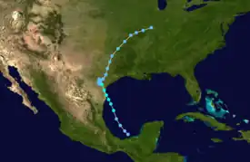 Observations from a reconnaissance flight on June 22 indicated that a large area of showers and thunderstorms in the Gulf of Mexico was producing winds up to 40 mph (64 km/h). Because no circulation was reported, it was operationally classified as a tropical low, though radar stations along the Gulf Coast of Mexico indicated a circulation. Thus, the system became a tropical depression at 0600 UTC on June 22, while located in the Bay of Campeche. The depression strengthened and was estimated to have become a tropical storm on June 23. By early on the following day, the storm peaked with winds of 45 mph (72 km/h). Later that day, it made landfall near Corpus Christi, Texas at the same intensity. The storm weakened slowly and moved across the Central United States, before dissipating over Illinois on June 28.[4][6]