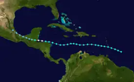 A tropical wave developed into a tropical depression near the Windward Islands on July 10. That day, the depression intensified into Tropical Storm Abby, striking Saint Lucia with winds of 65 mph (105 km/h). Abby tracked westward across the Caribbean Sea with little change in intensity. The storm brushed the northern coast of Honduras before intensifying into a hurricane on July 15, striking the offshore Roatán island with peak winds of 80 mph (130 km/h). Later that day, Hurricane Abby made landfall in southern British Honduras (present day Belize). Abby quickly weakened inland, moving across Guatemala and coastal Mexico. On July 17, Abby dissipated over the Mexican state of Veracruz.[6] However, the remnants later contributed to the development of Hurricane Celeste in the eastern Pacific.[4]