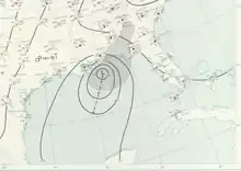 A strong tropical wave produced rainfall and gusty winds in The Bahamas and the Greater Antilles in mid-August. The wave was closely monitored for possible tropical cyclogenesis and special bulletins were issued by the United States Weather Bureau.[16] At 1800 UTC on August 17, Tropical Storm Cleo developed near Cat Island in The Bahamas. The storm headed northeastward and immediately began to intensify.[17] Operationally, the United States Weather Bureau at the hurricane warning center in Miami did not initiate advisories on Cleo until 1500 UTC on August 18. Sustained winds were already 70 mph (110 km/h) at the time, as recorded by a reconnaissance aircraft flight.[18] By 1800 UTC on August 18, Cleo strengthened into a hurricane.[17]