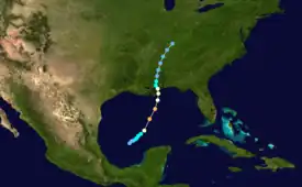 A trough was located over the Gulf of Mexico on September 8, which interacted with a weakening cold front to produce a low pressure area, and eventually a tropical depression on September 12. On the next day, the system intensified into Tropical Storm Ethel, which began a period of rapid intensification a day later. By late on September 14, Ethel reached peak winds of 115 mph (185 km), presenting a well-defined eye. Operationally, the Hurricane Hunters estimated winds of 160 mph (260 km/h), making Ethel a Category 5 hurricane, although a reanalysis in 2016 downgraded Ethel to a Category 3. Cooler air caused a period of rapid weakening, and Ethel moved ashore near Pascagoula, Mississippi with sustained winds of 80 mph (130 km/h). The storm gradually weakened after moving inland, before eventually dissipating over southern Kentucky on September 17.[6][17]