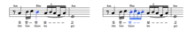The trot is known for being composed in a two-beat rhythm, also known as the duple metre. In its early days, trot music was often composed using the pentatonic scale and minor keys. This pattern is called an anhemitonic scale or anhemitonic pentatonic scale, which was characteristic in Korean 'Gyeonggi-minyo' and other folk music such as early Japanese enka.[10] The pentatonic scale consists of five degrees: of the natural major scale, the 4th and 7th degrees are omitted, and to form the pentatonic minor scale, all these 5 degrees will descend 3 degrees. Before 1950, the pentatonic minor scale dominated in popularity, however, the pentatonic major scale had started to become more popular.[11] After the Japanese occupation, trot music was composed using the heptatonic scale and major keys. In trot music, lower tones are generally sung with vibrato, while higher tones are sung with the flexing or turning technique called 'kkeokk-ki' (literally means flexing, Korean: 꺾기).