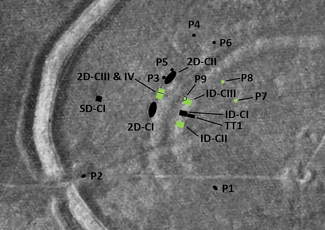 Four more pits were found and excavated; three in the area of the cuttings, and another inside the inner ditch; all contained Iron Age pottery sherds, including both Halltstatt and La Tène types.[61] Curwen also excavated the entire east gate area of the hillfort, revealing numerous pits and postholes.[69] It was apparent that not all the postholes could have been in use at the same time, since that would have rendered the gate impassable, and Curwen concluded that there must have been different gate layouts over the duration of the hillfort's use. He suggested that the set of holes A-B-D-E-G-H represented a double gateway, followed by K-N and Q-R. The three holes labelled pits 11–13 in the diagram were each about 7–8 feet deep and 4 ft square, each with a ramp leading down into them. These had never been used; the lack of weathering indicated they had been filled in very shortly after being dug. Curwen suspected that the arrangement of three deep holes in the eastern gate was mirrored in the western gate, with pit 2, from the 1928 dig, one of the three. He was unable to find a convincing interpretation for the holes, suggesting only that they might "represent a grandiose scheme of fortification which was begun shortly before the abandonment" of the hillfort.[70] The large wooden gates that may have relied on these postholes may have required an iron pivot mechanism; iron pivots are known from several other hillforts.[71] Of the three pits 11 to 13, his most careful notes were for pit 12, and there he noted the presence of many substantial blocks of flint, some which had been squared off, resembling the flint layer he had found in 1928 at the west entrance to the hillfort.[72]