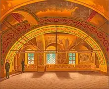 The Chamber was part of the palace complex built in the Kremlin in late 15th and mid 19th centuries. The tsarina's quarters must have been located in that part of the palace. It is situated on a ground floor and was built in the early 16th century. In the 1580s, it was rebuilt as a ceremonial reception room of Tsarina Irina Godunova, the wife of Tsar Feodor I of Russia.[1] The names of its builders are unknown; it may be assumed, however, that they were familiar with Italian Renaissance architecture.
