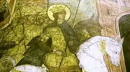 The walls of the chamber are decorated with paintings on a golden background. The paintings on the vault show episodes from Christian history associated with Emperor Constantine of Byzantium and his mother, Helena. On the slant of the eastern wall near which the tsarina's throne used to stand is a series of paintings depicting the conversion of princess Olga, the first Russian Christian princess, and her baptism. Shown on the northern wall are scenes from the Life of St. Dinara, a Georgian saint who, together with her host, valiantly defended the Christian faith. The paintings on the western wall feature scenes from the life of Empress St. Theodora.