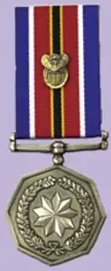 The Tshumelo Ikatelaho - General Service Medal was instituted by the President of the Republic of South Africa on 16 April 2003, and came into effect on 27 April 2003. It can be awarded to all ranks who have participated in military campaigns or operations which, while not warranting the institution of particular campaign medals, still justify the award of a medal for general service.[1][2] The bilingual title of the medal is in Tshivenda and English.