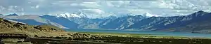 The lake is 20 to 50 kilometers southeast of the elevated valley of the core Rupshu Valley and falls within the greater Rupshu Plateau and valley area. The lake is ringed by mountains rising over 6,000 m (20,000 ft), including Mentok Kangri and Lungser Kangri. "Changpa", the nomadic migratory shepherds (pastoral community) of yak, sheep, goat, and horses of Tibetan origin and who are engaged in trade and work on caravans in Ladakh region, are the main inhabitants of the area.[5][6] Changpa (Champa) herders use the land of this valley as grazing ground and for cultivation.[4]