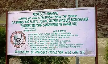 Tso Moriri is an administratively declared Wetland Reserve. Legally, shooting wildlife is prohibited. The State Department of Wildlife has set up a check post near Mahe Bridge at the entrance towards the lake.[8][9] WWF-India Project has established a field office at Korzok on the northwest shore of Tso Moriri for ‘Conservation of High Altitude Wetlands in Ladakh Region’ to carry out surveys, interact with tourists, tour guides, act as information centre and conduct education awareness programmes for locals, tourists etc.