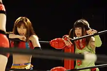 On December 31, Fujimoto entered the Super Ice-Cup tournament, defeating Mai Ichii in her first round match.[24] On January 4, 2010, Fujimoto first defeated Hikaru Shida in the semifinals and then Emi Sakura in the finals to not only win the Super Ice-Cup, but to also become the new ICE×60 Champion.[25] After successful defenses against Hamuko Hoshi, Makoto and Hikari Minami, Fujimoto lost the title to Miyako Matsumoto on March 21.[26][27][28][29] For most of 2010, Fujimoto was involved with NEO Japan Ladies Pro Wrestling performer Natsuki☆Taiyo, first as her partner and then opposite her, unsuccessfully challenging her for the NEO High Speed Championship on May 3.[30] On October 20, Fujimoto and Shida received their first shot at the International Ribbon Tag Team Championship, but were defeated by Emi Sakura and Nanae Takahashi.[31] On December 11, Fujimoto became a champion again, when she defeated Kazumi Shimouma and Hamuko Hoshi for the Triangle Ribbon Championship.[32] Just two weeks later on December 23, Fujimoto and Shida defeated Sakura and Takahashi in a rematch to become the new International Ribbon Tag Team Champions.[33] Fujimoto's December was capped off three days later, when she defeated Command Bolshoi to regain the ICE×60 Championship, meaning that she now held all three Ice Ribbon championships simultaneously.[34] Fujimoto and Shida went on to successfully defend the International Tag Team Championship against Hikari Minami and Riho on January 4, 2011, and against the teams of Mochi Miyagi and Ryo Mizunami, and Makoto and Riho on February 6, winning the "Ike! Ike! Ima, Ike! Ribbon Tag Tournament" in the process.[35][36] In early 2011, Fujimoto began feuding with Ice Ribbon newcomer Ray, starting on February 26, when Ray pinned Fujimoto in a tag team match, only her second match in the promotion.[37] On March 2, Ray challenged Fujimoto for the Triangle Ribbon Championship in a three-way match, which also included Chii Tomiya. The match ended with both Fujimoto and Ray simultaneously pinning Tomiya, which resulted in Fujimoto being stripped of the title.[38] She would regain the title three days later by defeating Hikaru Shida and Makoto.[39] On March 19, Ray and Emi Sakura defeated Fujimoto and Shida in a non-title match and afterwards laid a challenge for the International Ribbon Tag Team Championship.[40] On March 21, Fujimoto successfully defended the ICE×60 Championship against Ray.[41] However, five days later, Ray and Sakura defeated Fujimoto and Shida for the International Ribbon Tag Team Championship, ending Muscle Venus' reign at 93 days and breaking Fujimoto's Triple Crown.[42] On June 29, Fujimoto lost the Triangle Ribbon Championship to Neko Nitta in a match that also included Ray.[43]