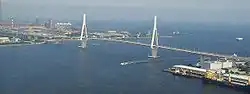 The Tsurumi Tsubasa Bridge is a cable-stayed bridge located at the western side of Yokohama Bay and is part of an expressway across the Port of Yokohama, Kanagawa prefecture in Japan. The bridge has a main span of 510 metres (1,670 ft) and two side spans of 255 metres (837 ft).[1]