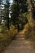 Ponderosa pine and Douglas fir trees are the most common trees observed on Tubbs Hill.[5] Other trees such as the grand fir, western larch, and western white pine are present in lesser numbers.[2] Ponderosa pine and Douglas fir are both conifers but have different growing conditions and the areas in the park where they are found often show notably different understories and habitat types. Ponderosa pine predominates on the south and western facing slopes of the hill where there is more sun and wind whereas Douglas fir is more common on the north and east facing slopes where it is more wet; the wetter habitats are dense with foliage while the drier areas are more open, grassy, and lacking in shrubs.[5] Shrubs that can be found on the trail include kinnikinnick, ocean spray, thimbleberry, paxistima myrsinites, ninebark, Oregon grape, serviceberry, snowberry, and a variety of fern species.[5] Different species of lichen and mosses can also be observed in the park.