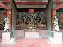 The Sam Shing Temple (三聖宮) is dedicated to the Marshal Yuen Tan Fuk Fu (玄壇伏虎元帥; 'Tiger Suppressing General'), Hung Shing (洪聖) and Hau Wong (侯王). It was built by the To (陶) clan of the area, whose old ancestral hall is on its left, during the reigns of Yongzheng Emperor (1722-1735) and Qianlong Emperor (1735-1796). It was rebuilt in 1993, using modern materials including concrete and steel bars, while maintaining the shape of the original building.[1]