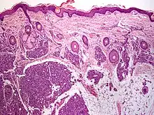 A tufted angioma (also known as an "Acquired tufted angioma," "Angioblastoma," "Angioblastoma of Nakagawa," "Hypertrophic hemangioma," "Progressive capillary hemangioma," and "Tufted hemangioma"[1][2]) usually develops in infancy or early childhood on the neck and upper trunk, and is an ill-defined, dull red macule with a mottled appearance, varying from 2 to 5 cm in diameter.[2]:โ596โ