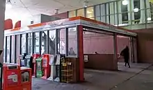 The station was not constructed directly under Washington Street; it is angled towards Tremont Street to the west, as the line then curves towards Back Bay. Unlike the older stations, there is a single headhouse on the west side of Washington Street rather than smaller entrances on both sides of the street. This entrance is located under an overhang of a Tufts Medical Center building. There is a secondary entrance without elevator access, located on Tremont Street at Oak Street. Adding elevators to the South Cove entrance was considered by the MBTA in 2017.[3]