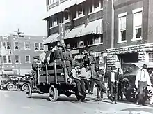 The gunshots triggered an almost immediate response, with both sides firing on each other. The first "battle" was said to last a few seconds or so, but it took a toll, because ten whites and two black men lay dead or dying in the street.[12] The black men who had offered to provide security retreated toward Greenwood. A rolling gunfight ensued. The armed white mob pursued the black contingent toward Greenwood, with many stopping to loot local stores for additional weapons and ammunition. Along the way, bystanders, many of whom were leaving a movie theater after a show, were caught off guard by the mobs and fled. Panic set in as the white mob began firing on any black people in the crowd. The white mob also shot and killed at least one white man in the confusion.[63] According to the Oklahoma Historical Society some in the mob were deputized by a police officer and instructed to "get a gun and get a nigger".[16] So began a major attack on the African-American community.[14][13]